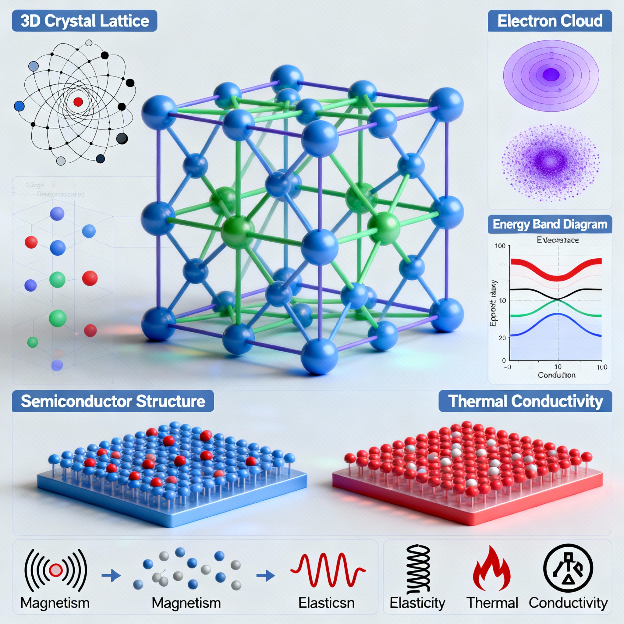يُقدم هذا المقياس، الموجه لطلاب السنة الرابعة فيزياء، دراسة شاملة ومتعمقة للخصائص الفيزيائية للمواد الصلبة. يبدأ المقياس من الأساسيات مع علم البلورات، حيث يغطي مفاهيم الشبكة البلورية، وأنظمة التناظر، وحيود الأشعة السينية لتحديد البنية. ثم ينتقل إلى دراسة الروابط البلورية وطاقة التماسك التي تحفظ استقرار المادة.